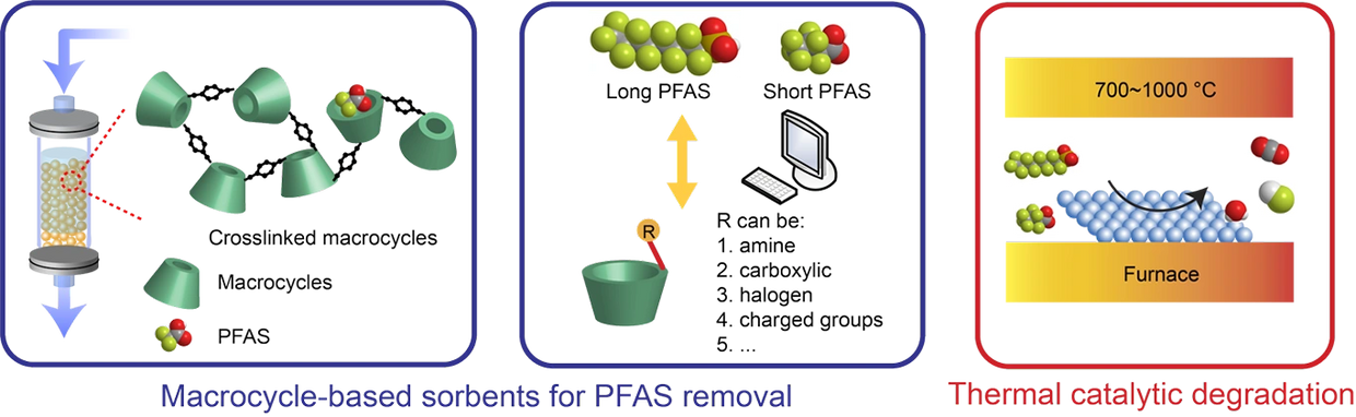 Leveraging synthetic chemistry, our group has advanced the application of macrocyclic sorbents for groundwater remediation, targeting both legacy and emerging contaminants—including chlorinated solvents, 1,4-dioxane, and per- and polyfluoroalkyl substances (PFAS). This research has been supported by NIH, DoD SERDP, NSF, and EPA. A key outcome is the development of a series of highly efficient, cationic, and fluorinated macrocyclic sorbents, from both experimental and simulation approaches. One of these sorbents has demonstrated outstanding performance in capturing both short- and long-chain anionic PFAS. In diluted aqueous film-forming foam (AFFF) matrices, it has also outperformed commercial products in removing short-chain, nonionic, and zwitterionic PFAS. We are currently advancing scalable, column-based studies as part of our ongoing research. Specifically for PFAS, we are integrating sorbent-based capture with thermal treatment technologies to enhance the degradation and minimization of these recalcitrant compounds